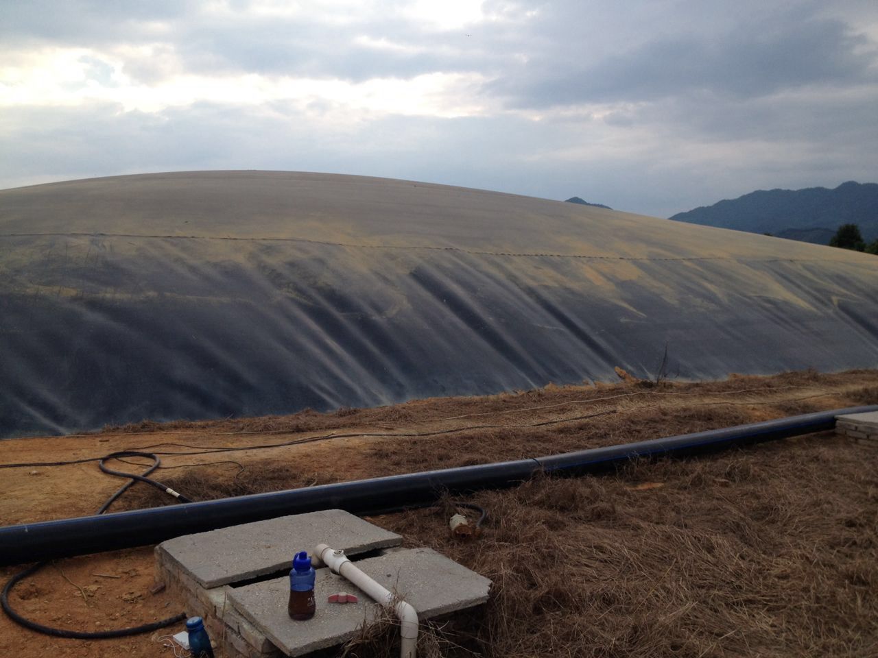 黑色土工膜覆蓋的沼氣池,學名“全封閉厭氧塘”