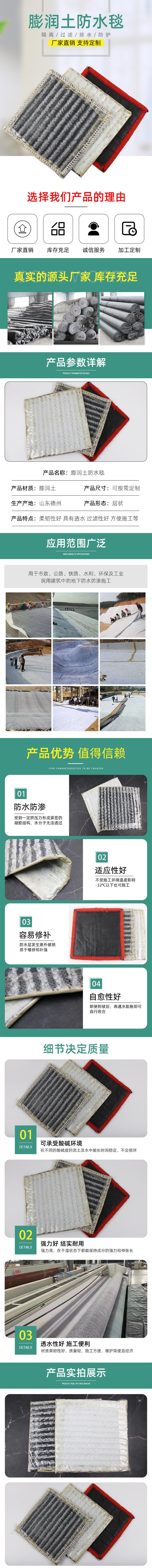 產(chǎn)品介紹: 膨潤防水毯是一種專門用于人工湖泊水景、垃圾填埋場、地下車庫、樓頂花園、水池、油庫及化學品堆場等防滲漏的土工合成材料,它是由高膨脹性的鈉基膨潤土填充在特制